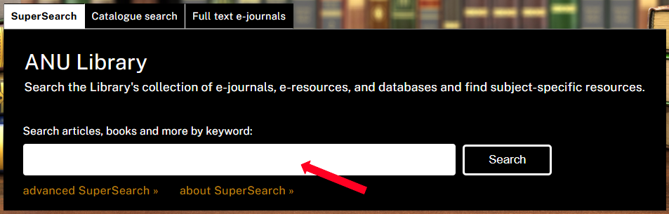 SuperSearch is the ANU Library search and discovery platform, the gateway to a wealth of scholarly content like books, e-books, journal articles, e-resources, audio-visual material, open access resources, and more.
